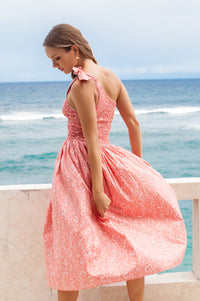 This show-stopping one-shoulder Sienna dress has a fitted bodice that's smocked at the bust before falling to a floaty, ankle-grazing hem. Handmade from organic fabric and adorned with one-shoulder tie this stunning number midi length dress is ideal for balmy weather events and sunset soirees.