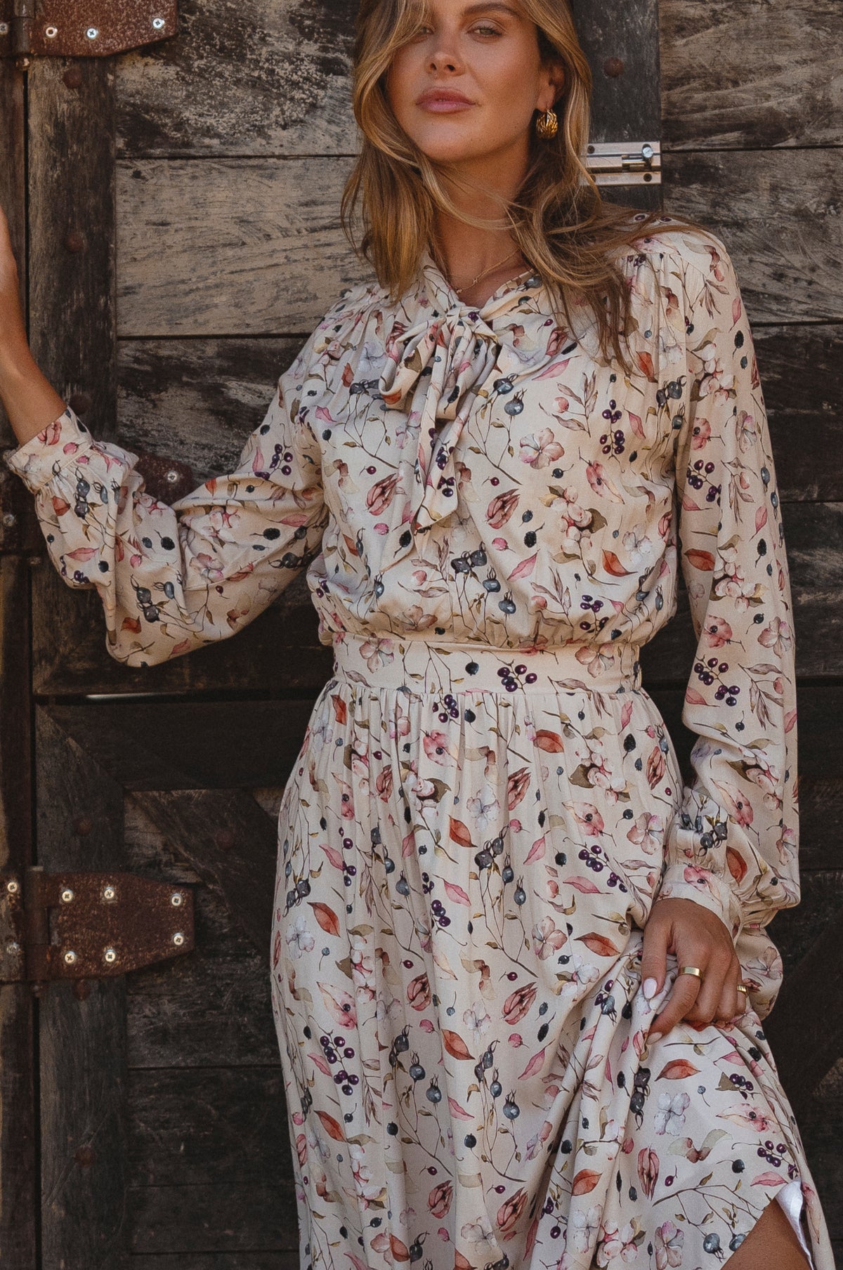 Our Evelina midi dress channels subtle allure with its beautiful details and timeless shape. The softly gathered shoulders and sculpted tie-neckline bring gentle structure, while the cinched waist and fluid skirt create effortless movement.