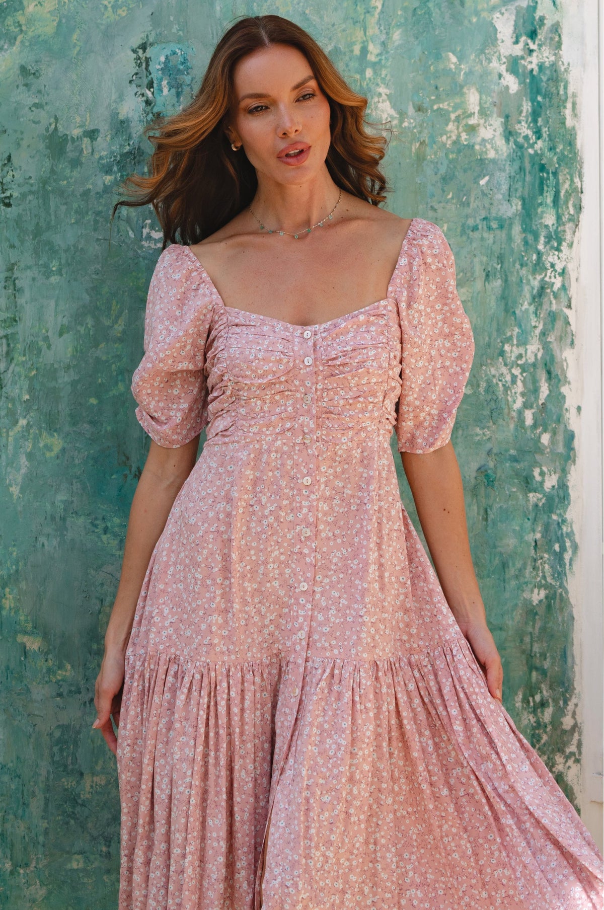 Beautiful puff sleeves, smocked square shape back and divinely designed gathered front detailing come together to create this easy-to wear feminine dress that speaks for itself.