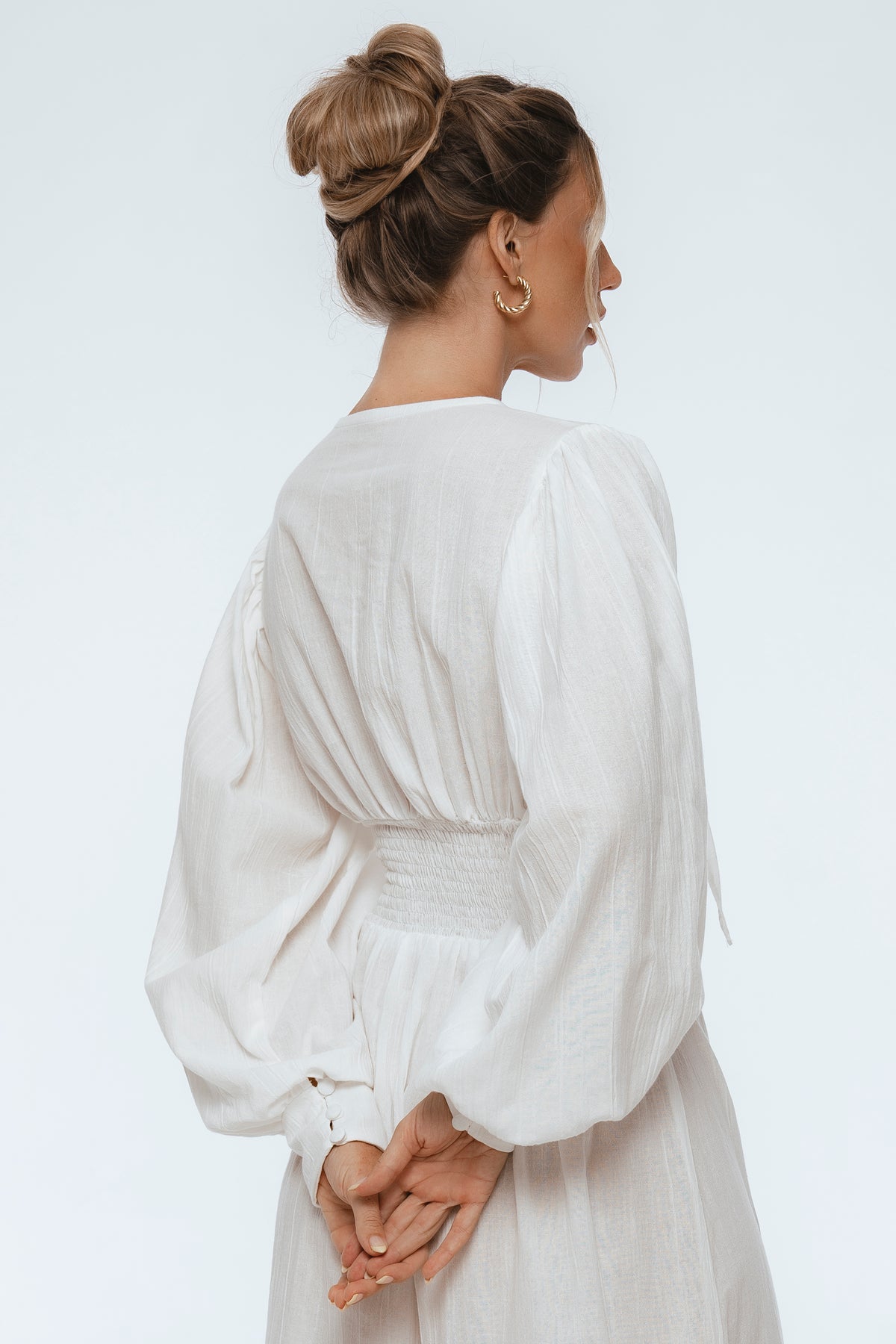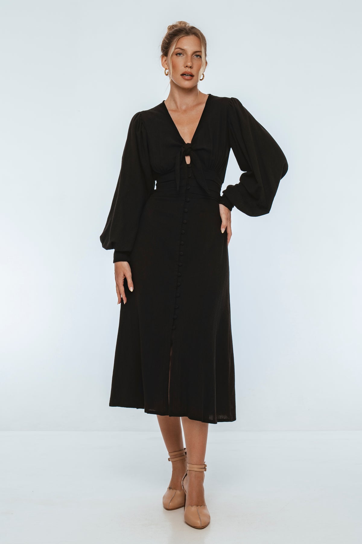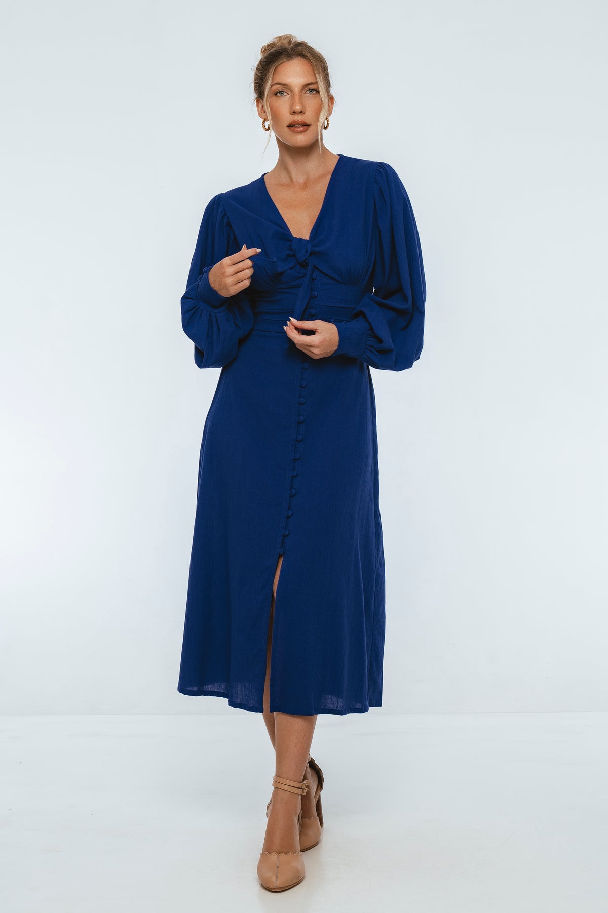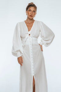 This romantic linen midi dress makes a graceful impression with its sculptural silhouette and attention to detail. Featuring a delicate front tie, fabric covered buttons, and voluminous balloon sleeves with buttoned cuffs, it blends elegance and comfort effortlessly. The smocked back waistband ensures a flattering fit and every day comfort.