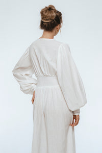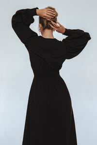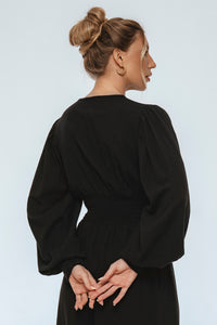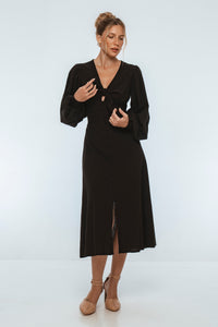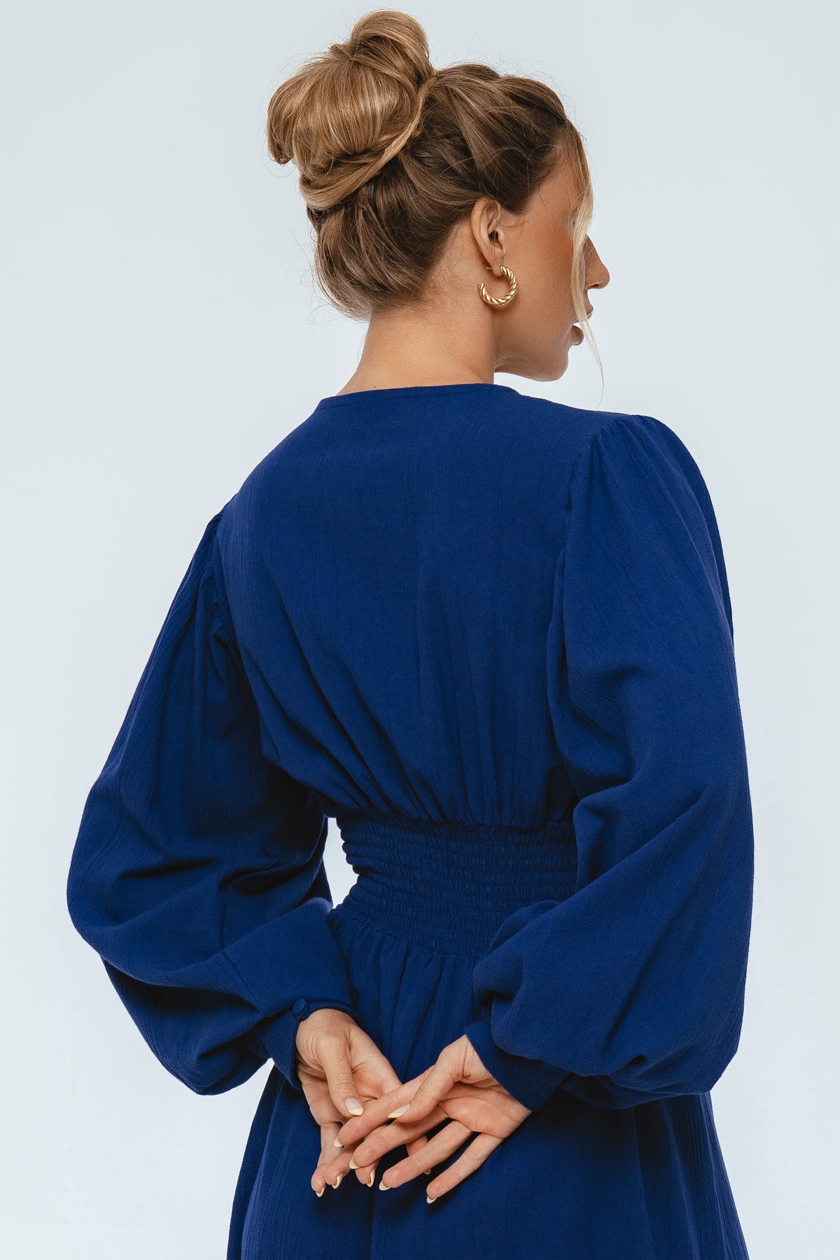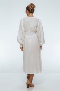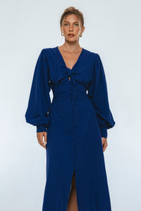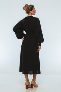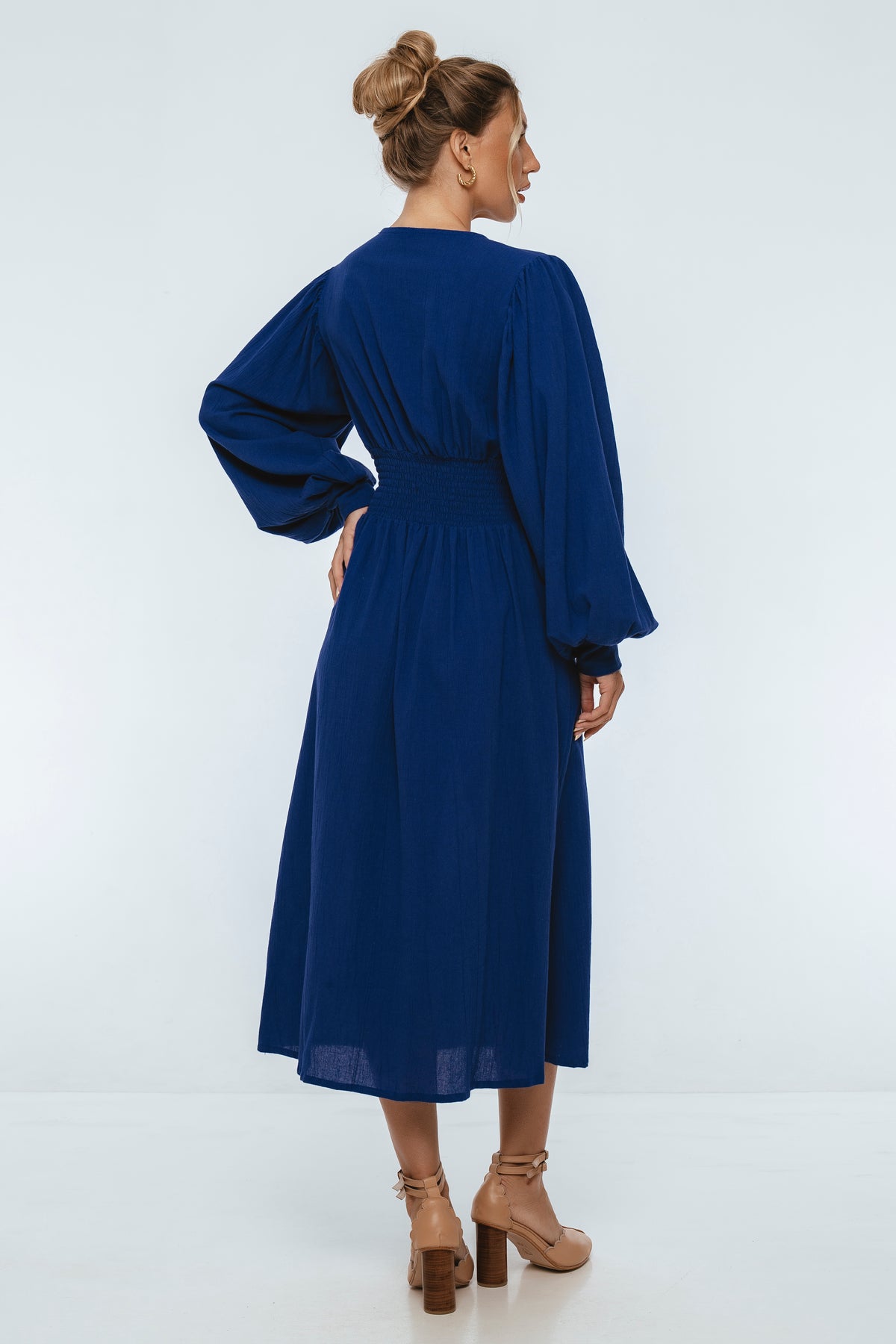 This romantic linen midi dress makes a graceful impression with its sculptural silhouette and attention to detail. Featuring a delicate front tie, fabric covered buttons, and voluminous balloon sleeves with buttoned cuffs, it blends elegance and comfort effortlessly. The smocked back waistband ensures a flattering fit and every day comfort.