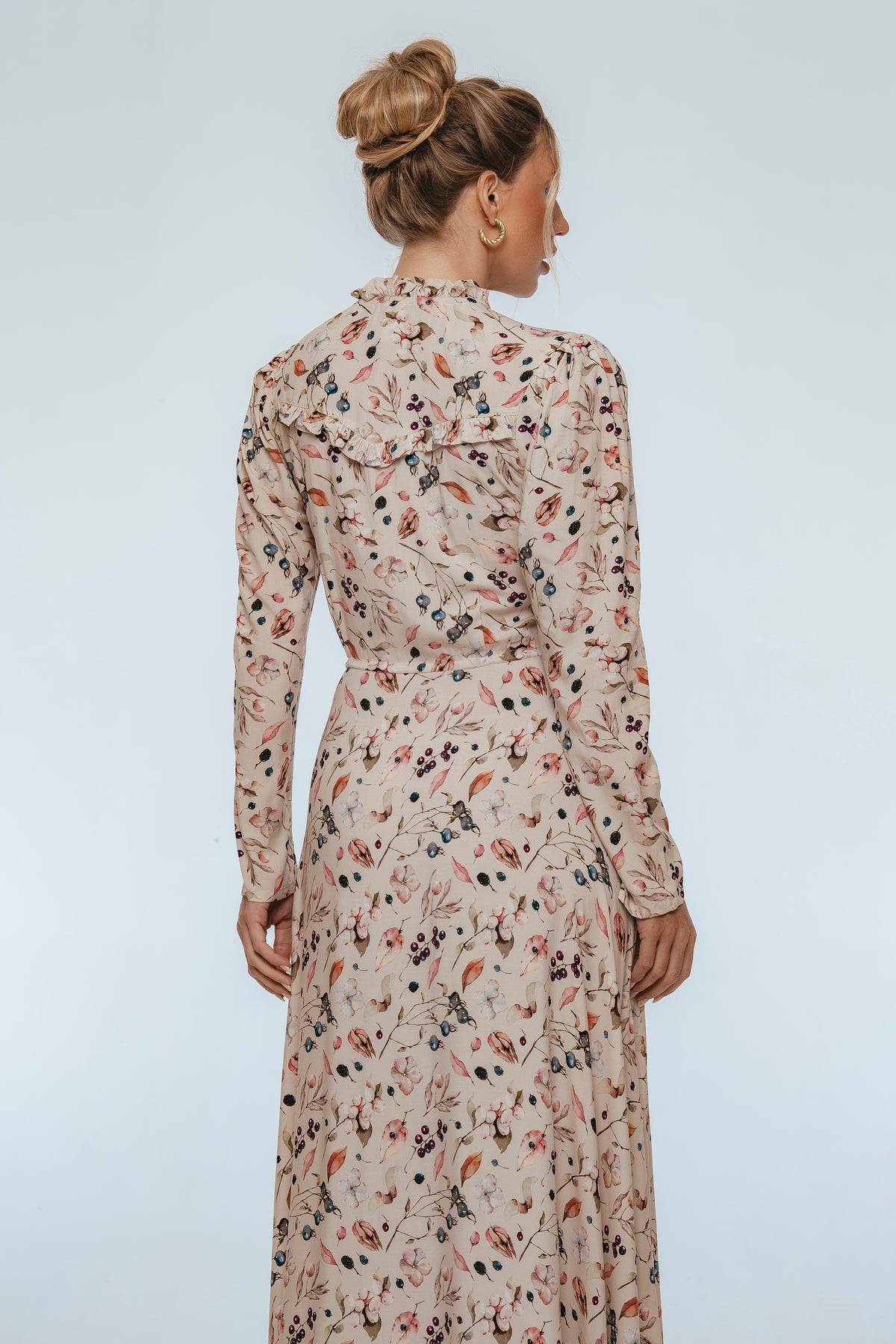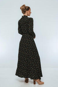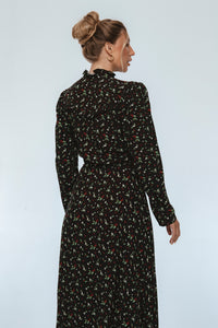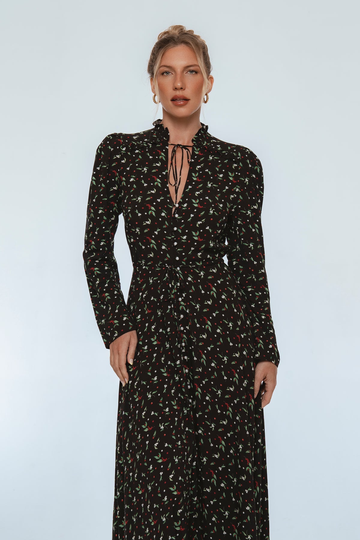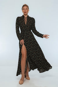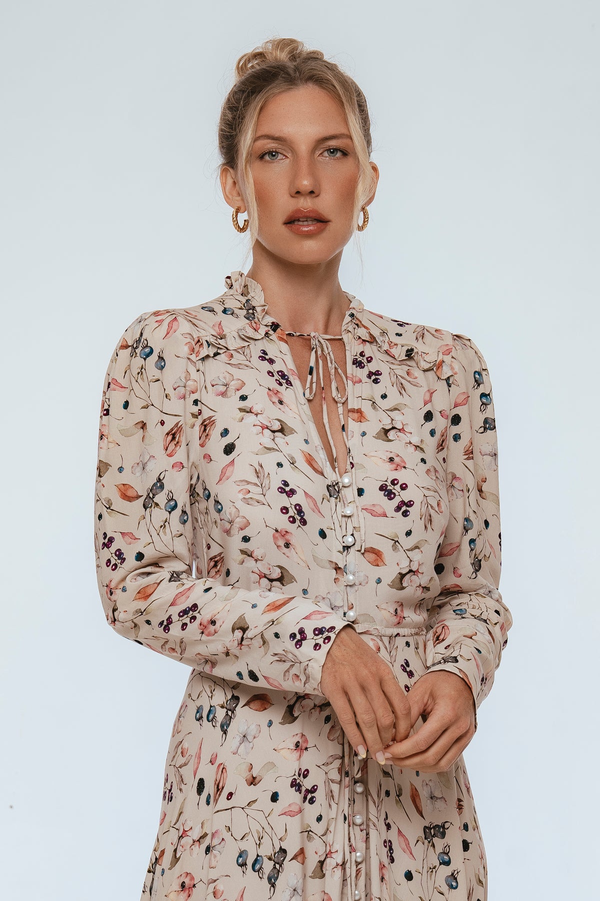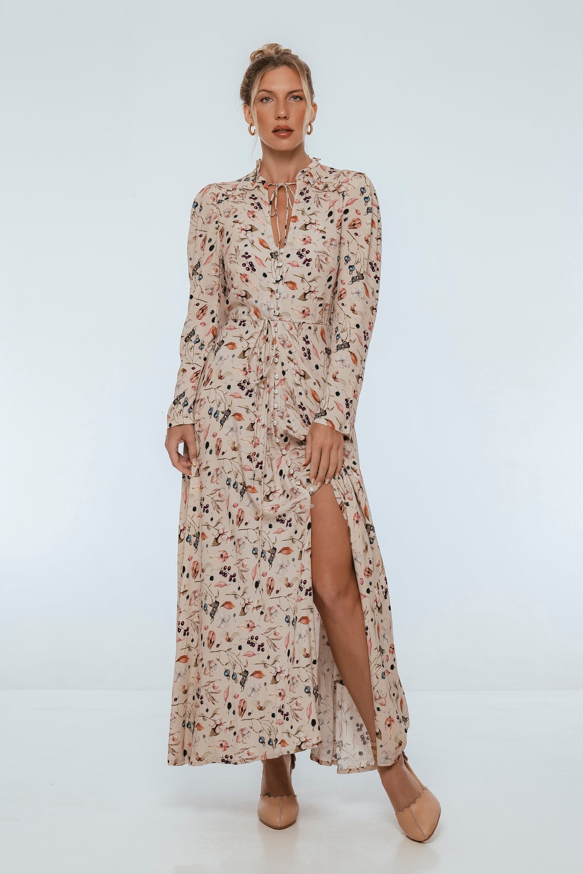Our flowy Poeme maxi dress channels effortless romanitc charm. Designed with long sleeves, a flattering tie neckline, and a ruffled collar it is adorned with pearl buttons and a drawstring at the waist, creating a fitted shape that flows into a fluid, full-length skirt.