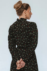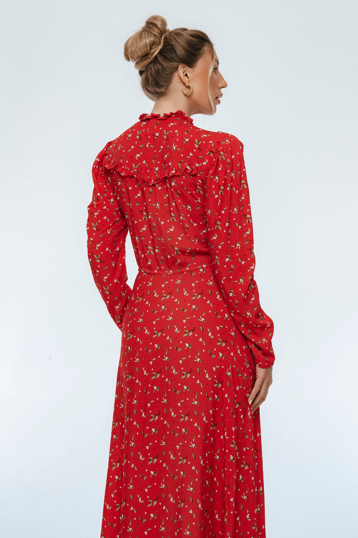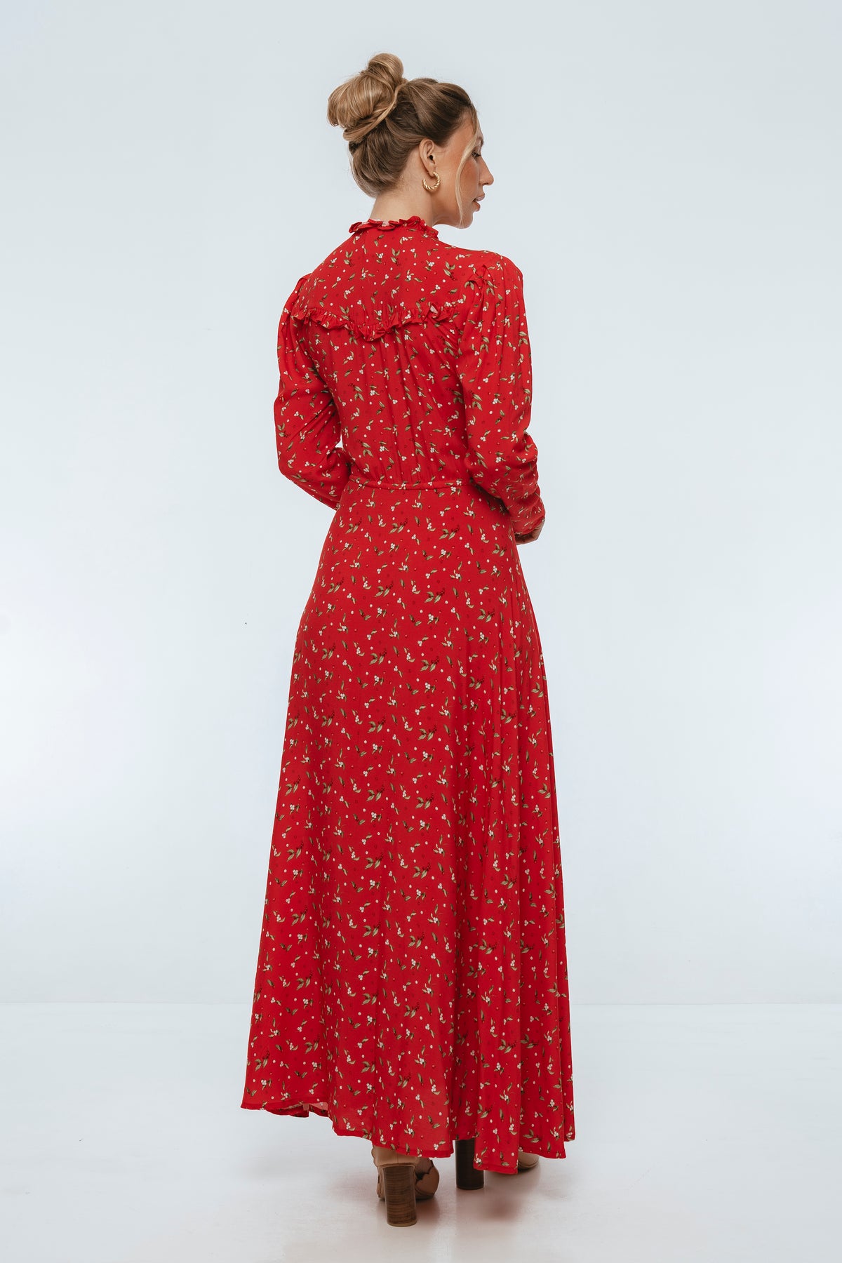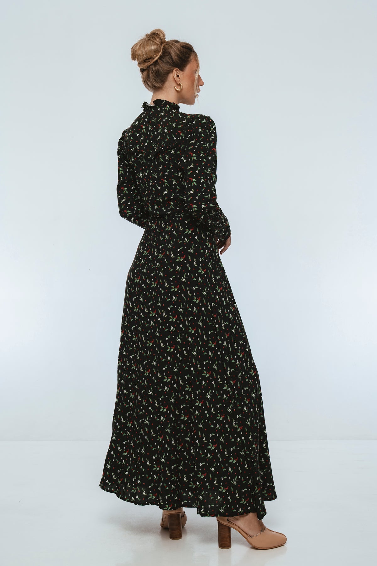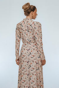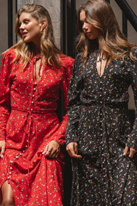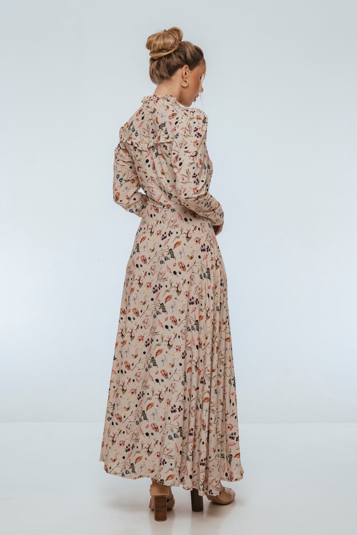 Our flowy Poeme maxi dress channels effortless romanitc charm. Designed with long sleeves, a flattering tie neckline, and a ruffled collar it is adorned with pearl buttons and a drawstring at the waist, creating a fitted shape that flows into a fluid, full-length skirt.