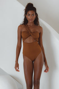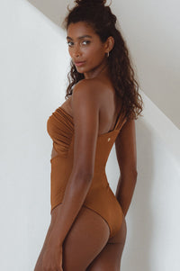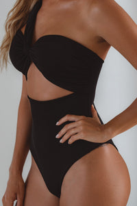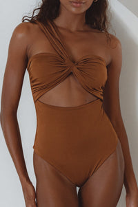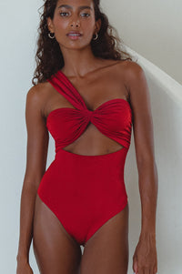 Feeling confident on vacation is easy wearing our sweeping one shoulder Ibiza Swimsuit.