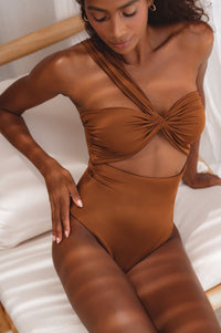 Feeling confident on vacation is easy wearing our sweeping one shoulder Ibiza Swimsuit.